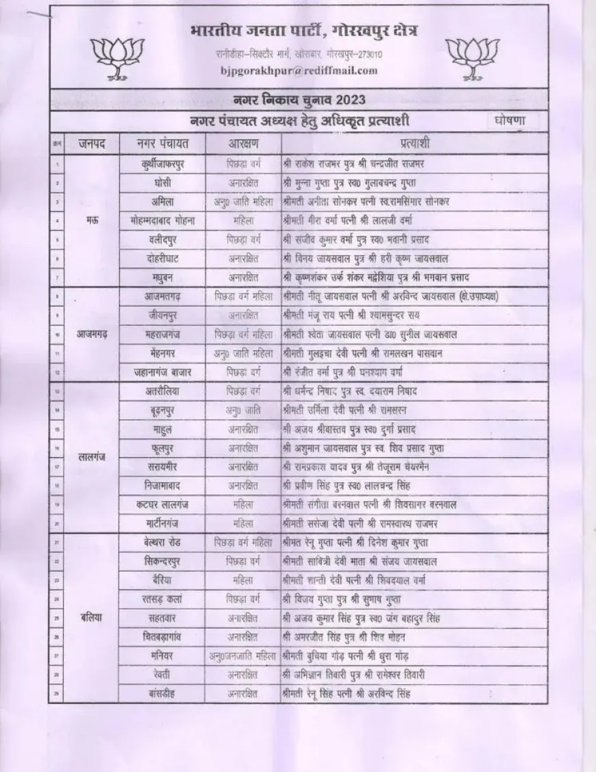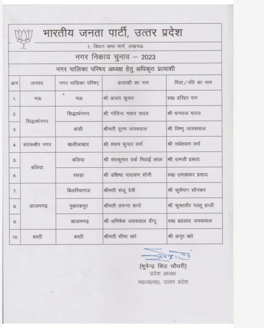बलिया। बीजेपी ने दूसरे चरण के निकाय चुनाव के लिए नगर निगम के प्रत्याशियों और नगर पंचायत अध्यक्ष पद के लिए उम्मीदवारों की पहली सूची जारी कर दी है.